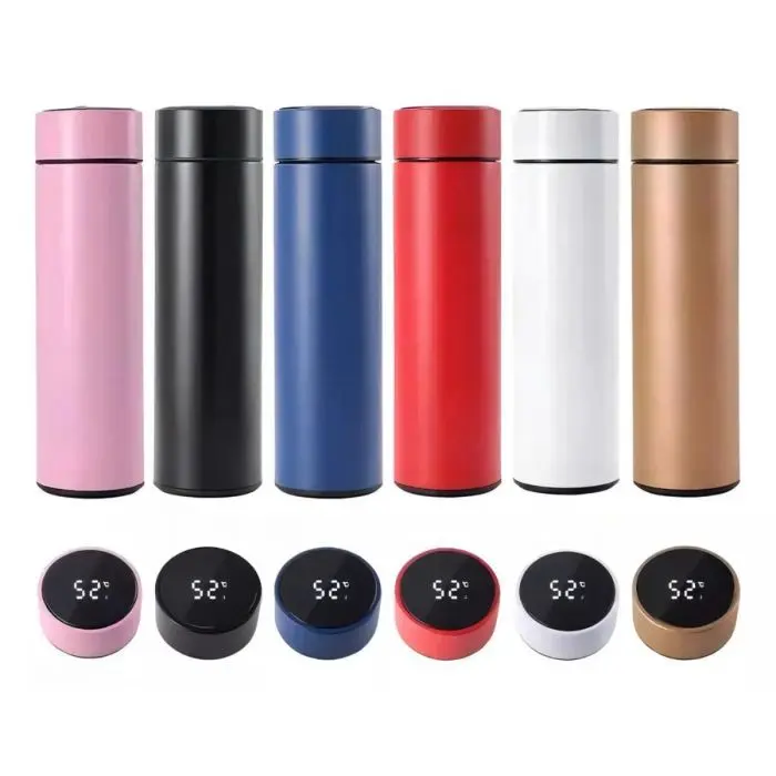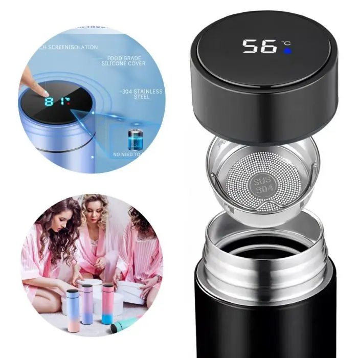 Termo inteligente fabricado completamente en acero inoxidable 304, ideal para mantener la temperatura de tus bebidas por más tiempo. Cuenta con una tapa a rosca que incluye un sensor LED táctil en la parte superior, el cual muestra la temperatura actual del líquido con solo apoyarlo con el dedo.